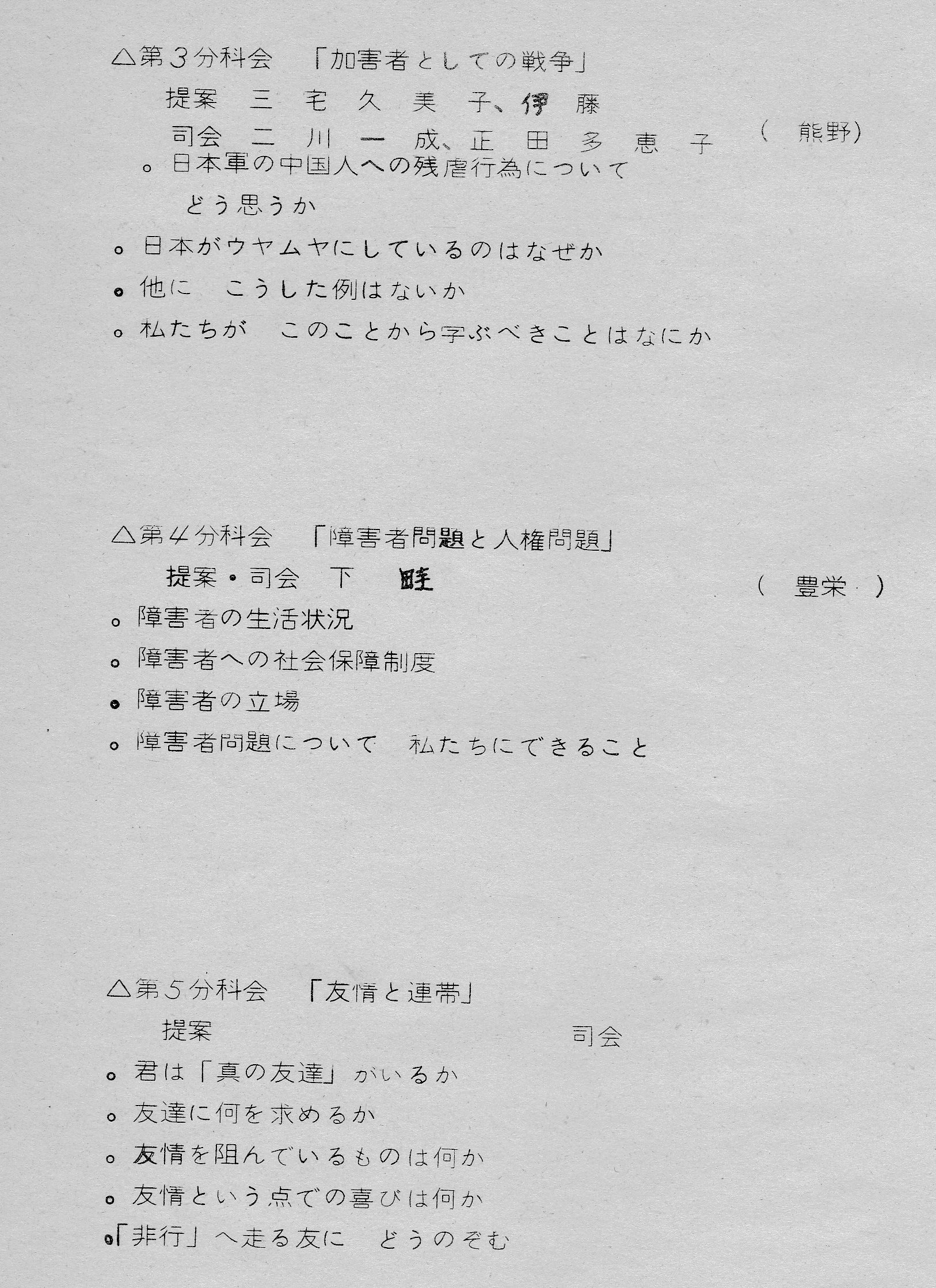 ・原発、教科書、戦争責任、障害者、友情の5分科会で討論する