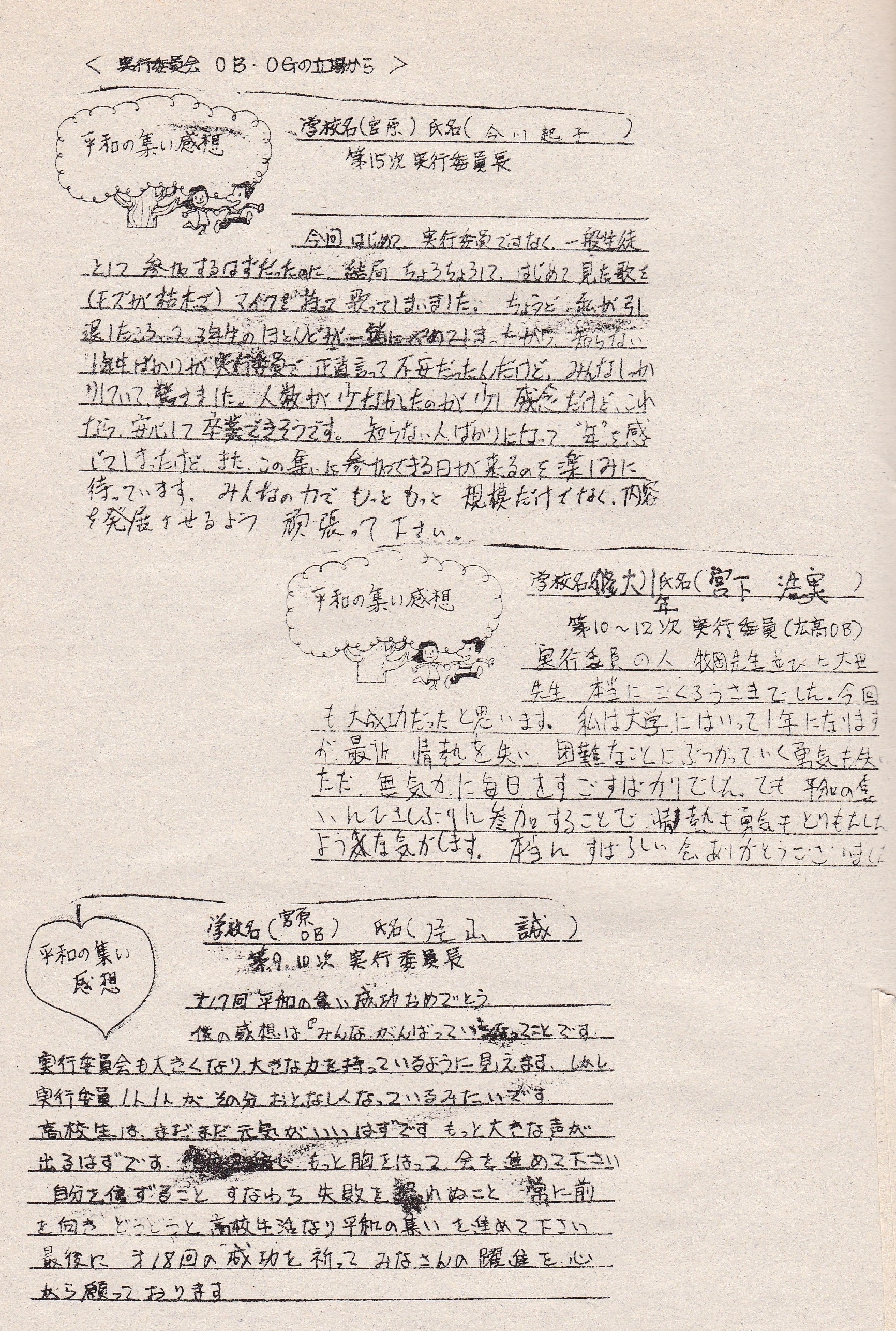 その内容は1年生の私にとって、毎回200人くらい集まっていると聞いて、かたぐるしくマジメな会だと考えて、実行委員なんかできるかなと、不安だったが、実行委員会に