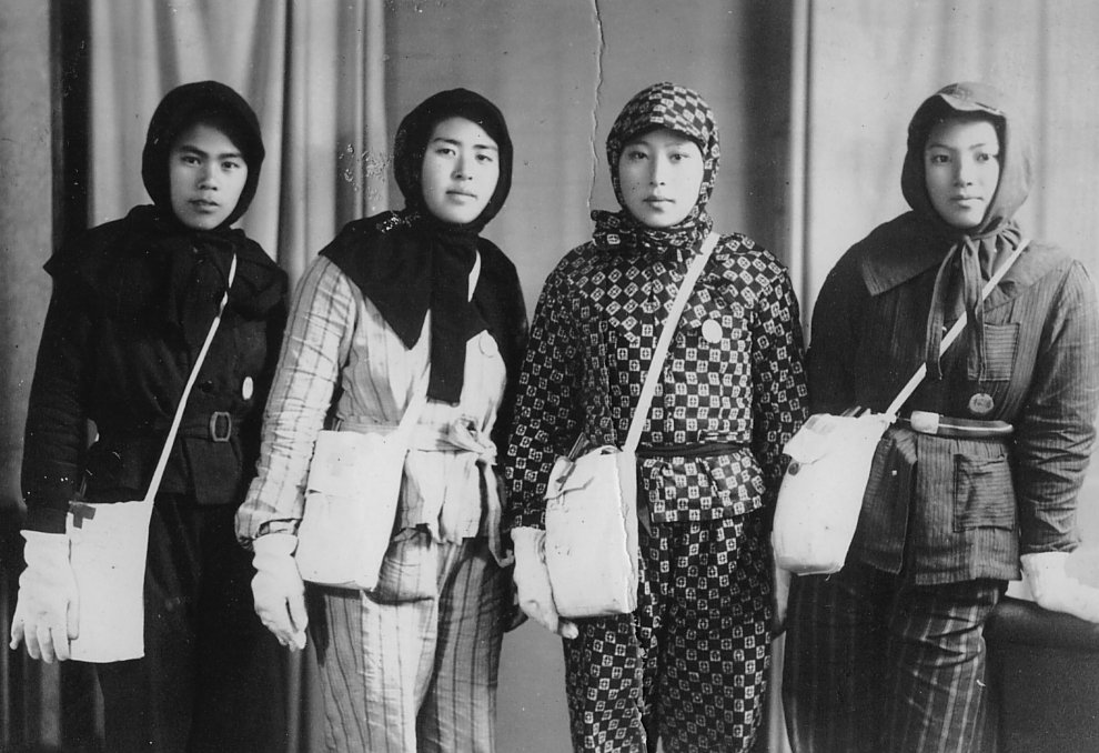 呉駅に朝七時頃集合し、木綿ガスリで作ってもらった防空服、防空頭巾で身支度をし救急袋を携えていましたが、その頃既に運動靴も無くなりかけていて草履で通勤していました。